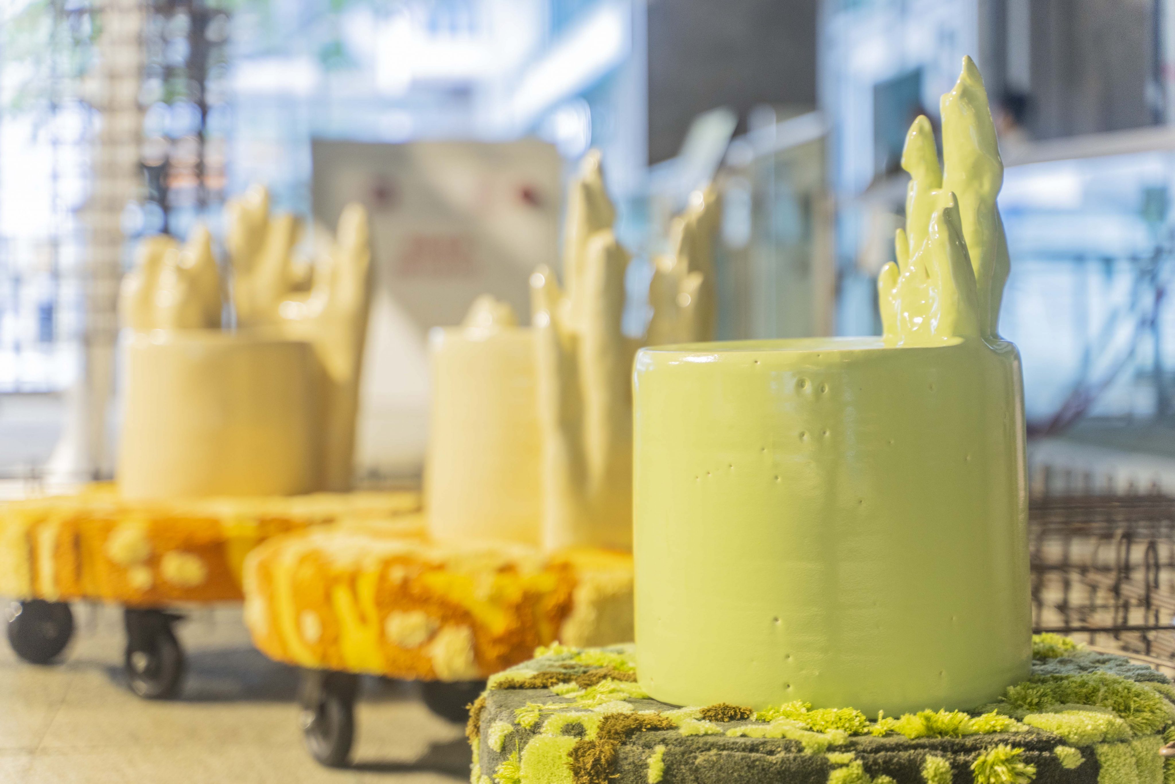 這些可移動的椅子稱為《Terra Mobiles》,可以讓幾個人坐在一起,也可以讓使用者倚靠或抱著色彩鮮豔、已打磨的粘土製岩石雕刻,令人不禁聯想起以前虎豹別墅裡奇幻的假山。對公眾而言,這作品在多面都具有吸引力。除了引人注目、平易近人而又打破常規的傢具,在視覺上更藏著歷史線索。兩位設計師還循環再用了香港太平地氈的紗線,造出簇絨、苔蘚狀的地毯,讓公眾可以觸摸和感受不同物料的質感。而作品上的輪子,不單讓人可以享受到虎豹別墅的開放空間,還提供了一個個人化和有趣的方式,以探索文化遺產與創新之間的關係。